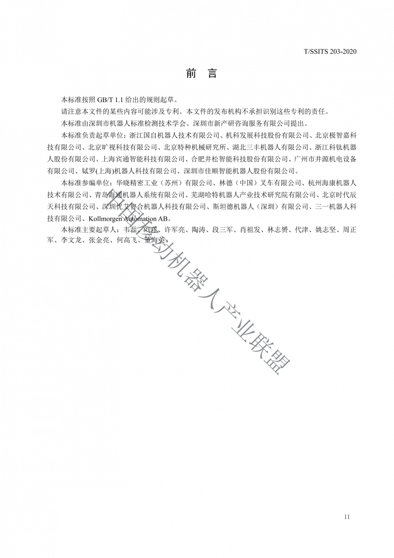 本標準負責起草單位∶浙江國自機器人技術有限公司、機科發展科技股份有限公司、北京極智嘉科技有限公司、北京曠視科技有限公司、北京特種機械研究所、湖北三豐機器人有限公司、浙江科鈦機器人股份有限公司、上海賓通智能科技有限公司、合肥井松智能科技股份有限公司、廣州市井源機電設備有限公司、鈦羅(上海)機器人科技有限公司、深圳市佳順智能機器人股份有限公司。?
