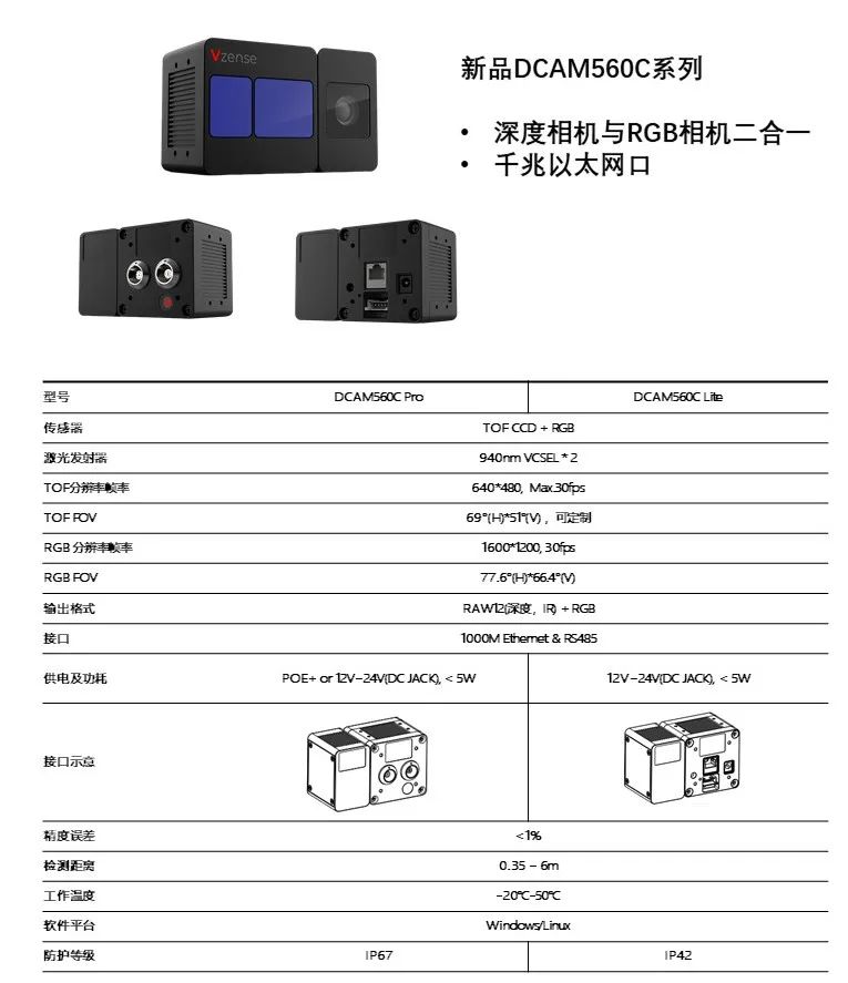DCAM560C產(chǎn)品系列集成了團(tuán)隊(duì)近年來(lái)的研究成果,將2D RGB圖像與3D ToF面陣相機(jī)技術(shù)相結(jié)合,輸出在時(shí)間和空間上重合的RGB和3D圖像,每個(gè)像素都參與測(cè)距,不僅可以在獲取XY軸方向圖像的基礎(chǔ)上還能獲取Z軸方向上的距離信息,從而獲得高精度的深度圖,實(shí)現(xiàn)“三次元空間的感知能力”,用以滿足工業(yè)級(jí)客戶不同的使用場(chǎng)景,適用于工業(yè)自動(dòng)化,智能物流,智慧駕駛,智能安防,3D建模等需要3D感知物體與環(huán)境、構(gòu)建3D模型并進(jìn)行分析的領(lǐng)域。