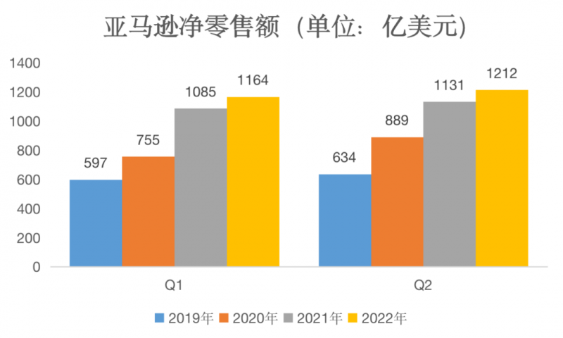 財報數據顯示,今年Q1亞馬遜凈零售額為1164億美元,同比增長7%;今年Q2凈零售額為1212億美元,同比增長還是7%。
