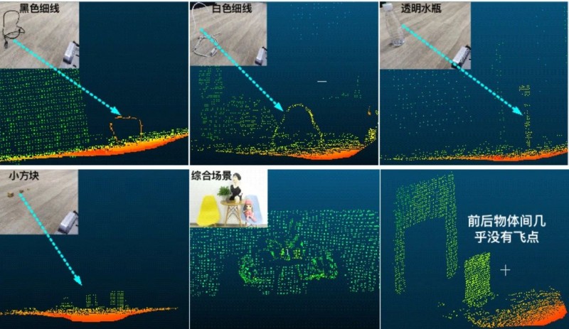 實拍場景與3D點云,可以看到dToF不僅在綜合場景中表現優秀,對小物體,細線甚至透明物體等極端場景都有非常好的表現,并且相對于其他ToF技術,dToF在飛點(前后物體邊界難以區分造成的)的表現上有天然優勢。