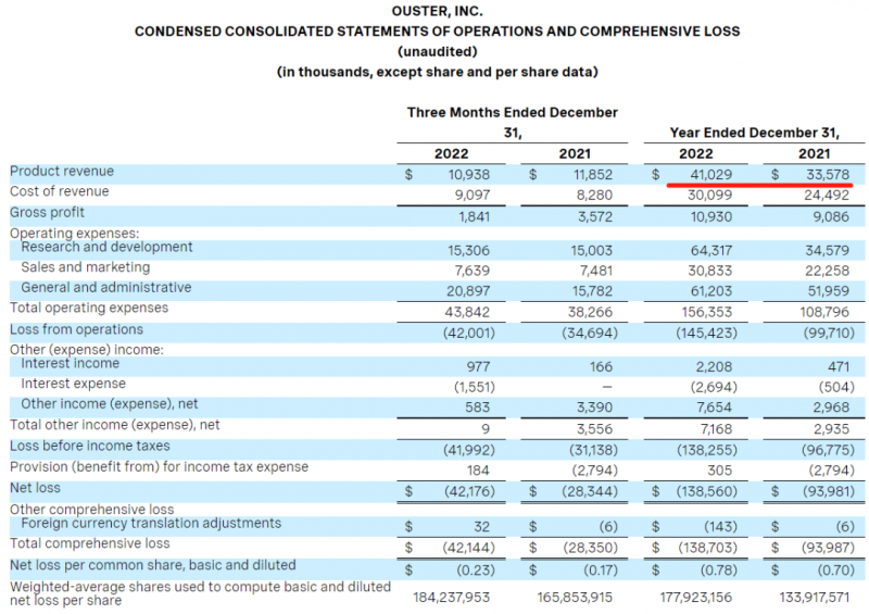 Ouster實(shí)現(xiàn)2022年的指導(dǎo)目標(biāo),報告全年收入增長22%。2022年全年財務(wù)摘要:實(shí)現(xiàn)了2022年的指引,收入為4100萬美元,毛利率為27%。2022年與新客戶和現(xiàn)有客戶簽訂了7000萬美元的業(yè)務(wù)。2022年發(fā)貨的傳感器超過8650個,迄今發(fā)貨的傳感器總數(shù)超過18500個。2022年凈虧損增加到1.39億美元,而2021年為9400萬美元。