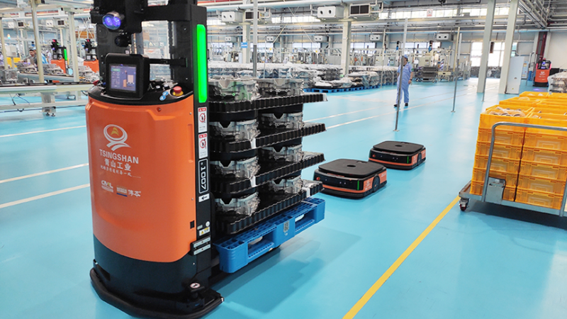 在汽車零部件行業,以重慶青山工業為例,海康機器人助力重慶青山工業打造智能制造新模式。青山工業是中國大型專業變速器生產企業和世界大型微型汽車變速器生產企業之一,專注于汽車傳動系統領域,長期服務長安集團、一汽集團、上汽集團、東風汽車、通用汽車、奇瑞汽車、長城汽車等多家客戶。青山工業投入使用數十臺??禉C器人潛伏及叉取AMR,實現多車型混行作業,多導航方式間平滑切換,實現生產車間內零部件存儲、配送的全流程物流自動化。潛伏AMR對清洗件的料車、油底殼專用貨架進行入庫、配送、空料車搬用。叉取AMR完成左右箱體、液壓模塊的入庫、配送上架、返空搬用。??禉C器人RCS系統與上層管理系統LES、客戶WCS無縫對接,實現了AMR與箱體出入庫滾筒線、液壓模塊及離合器上料液壓平臺、油底殼機械手等自動化設備的高精度對接,完成資源的統一調度。