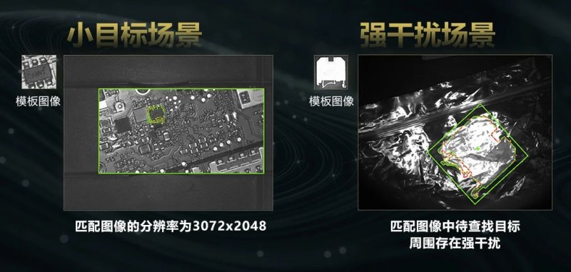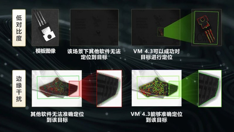 除了算法效率提升,VM4.3還進(jìn)一步優(yōu)化了算法性能。以模板匹配算法為例,通過采用更魯棒的邊緣定位技術(shù),在極低對(duì)比度及復(fù)雜邊緣干擾的情況下,VM4.3能夠精準(zhǔn)定位到目標(biāo)。
