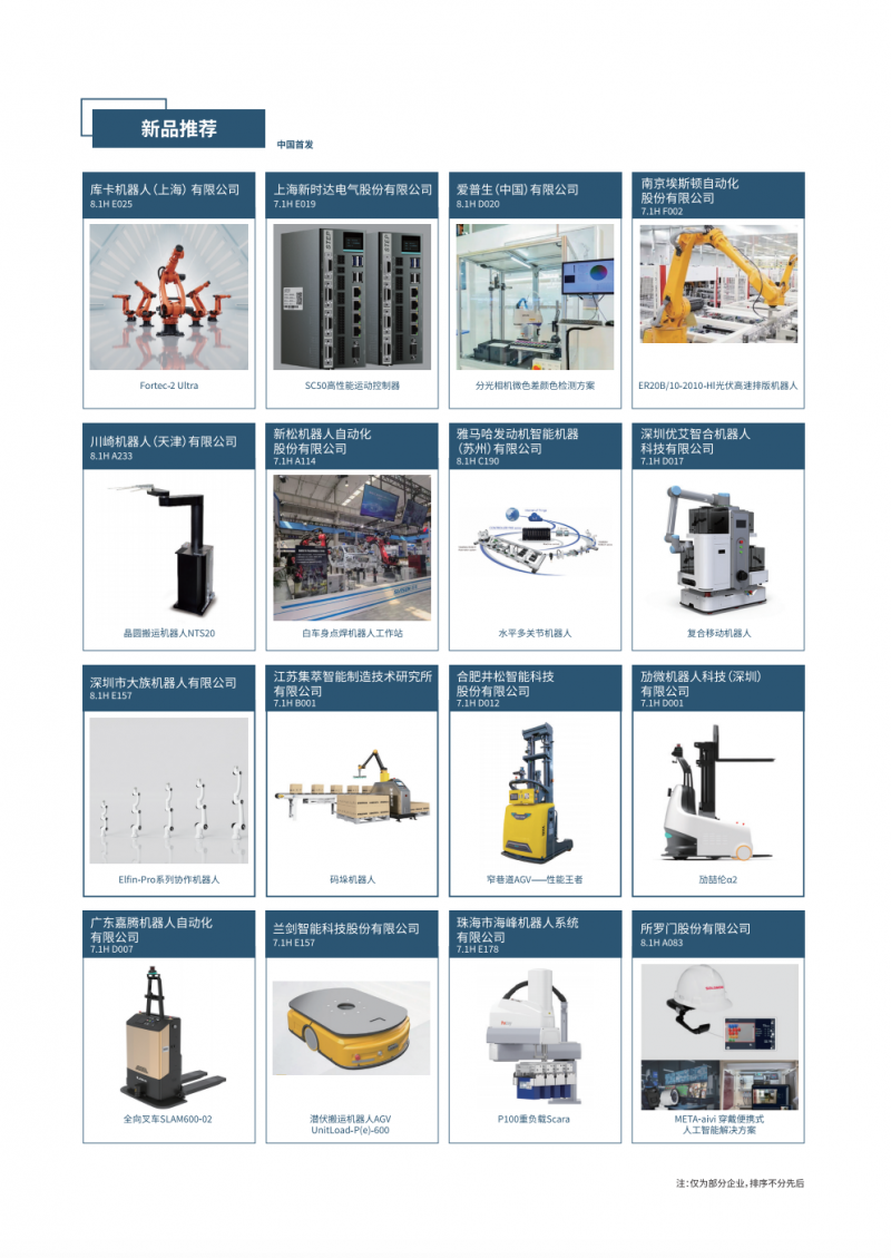 新品覆蓋了工業(yè)機(jī)器人本體、SCARA機(jī)器人、DELTA機(jī)器人、協(xié)作機(jī)器人、AGV/AMR、移動(dòng)復(fù)合機(jī)器人、減速器控制器傳感器和伺服電機(jī)執(zhí)行器等核心零部件、軟件及系統(tǒng)集成應(yīng)用等,彰顯最前沿的機(jī)器人技術(shù),為新型工業(yè)化注入新動(dòng)能。