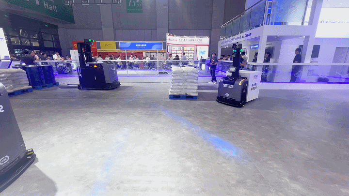 兩款今年新上市的智能叉車 SFL-CBD15 和 SFL-CDD16 在同一展區(qū)內(nèi)協(xié)同作業(yè),互為運(yùn)行障礙物。兩車在保持最快 2m/s 的運(yùn)行速度下依舊完美多次避讓,在避障激光、3D 避障相機(jī)、距離傳感器等多種傳感器的保護(hù)下實(shí)現(xiàn)高速暢行,順滑過彎,精準(zhǔn)避障,靈活繞行。