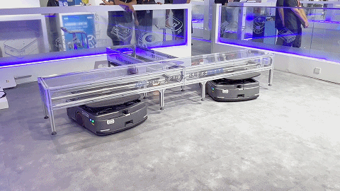 激光 SLAM 旋轉(zhuǎn)頂升搬運(yùn)機(jī)器人 SJV-SW600 作為最具性價(jià)比的新款機(jī)器人,前后配備雙激光,定位精度可達(dá) ±5mm,并支持頂升隨動(dòng)功能。現(xiàn)場三臺(tái) SJV-SW600 通過 Roboshop Pro 完成車體部署,基于 RDS 實(shí)現(xiàn)多車統(tǒng)一調(diào)度,對 T 字形托盤進(jìn)行完美協(xié)作搬運(yùn),三機(jī)同時(shí)頂升轉(zhuǎn)圈,盡顯絲滑流暢。