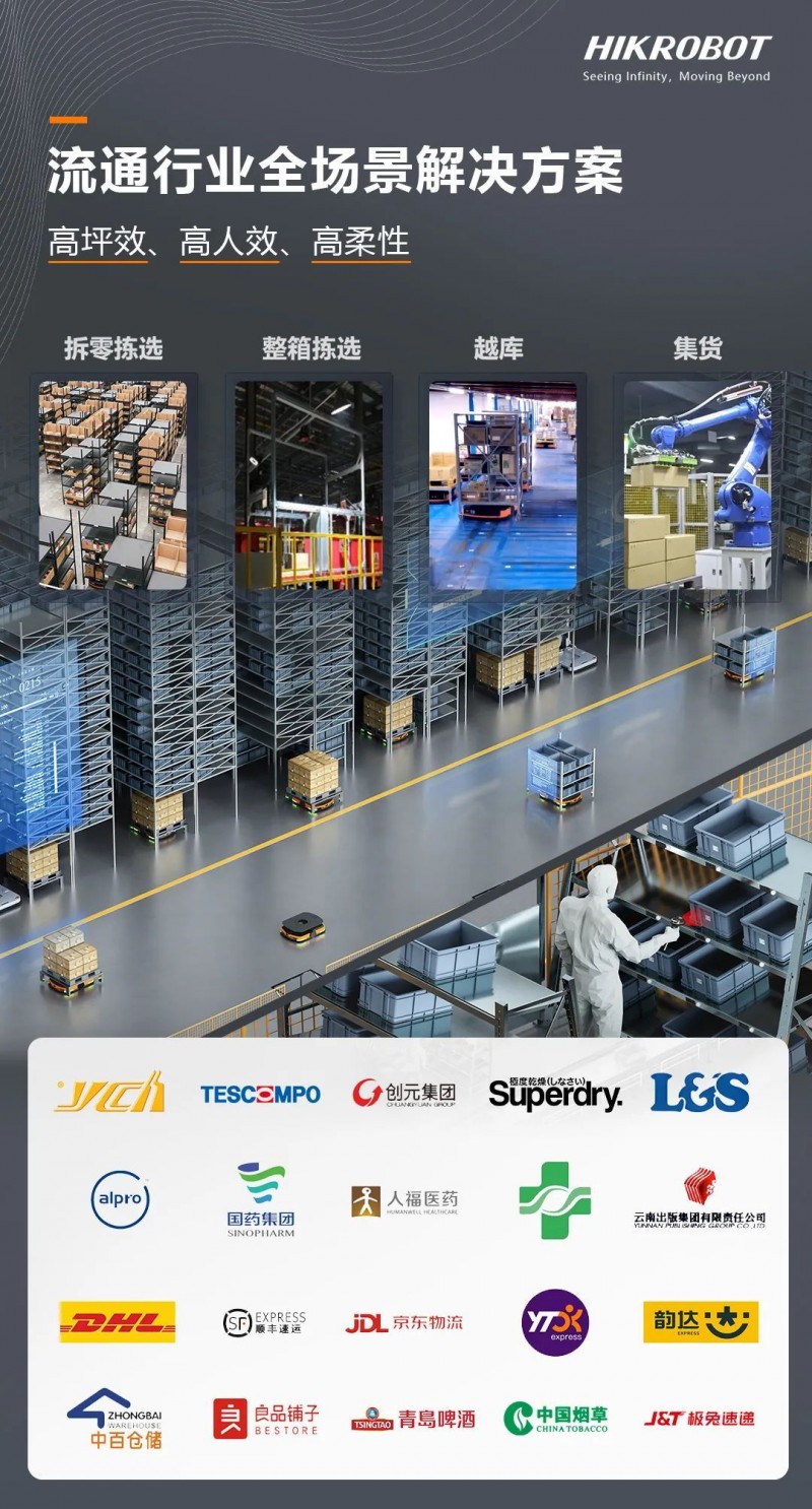 針對流通行業(yè)的業(yè)務波動量大、效率要求高、業(yè)務容錯率低、庫容要求高等核心難題,結合豐富的產(chǎn)品線和解決方案、智能算法等全場景規(guī)劃能力,海康機器人為行業(yè)伙伴打造了高坪效、高人效、高柔性的解決方案,覆蓋電商零售、鞋服、煙草酒水、商超、圖書出版、3PL、醫(yī)藥等細分行業(yè)。