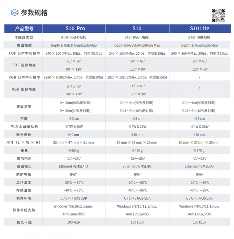 • 遠(yuǎn)距離抗干擾感知:S10基于dToF技術(shù)實(shí)現(xiàn)18米遠(yuǎn)距離探測,在室外強(qiáng)光(100kLux)環(huán)境下仍可穩(wěn)定輸出深度數(shù)據(jù),提升無人叉車、割草機(jī)、室外巡檢機(jī)器人等設(shè)備的避障能力。