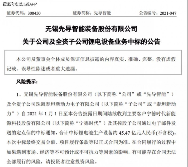 5月31日晚間,無錫先導智能裝備股份有限公司(簡稱“先導智能”)發(fā)布公告稱,先導智能及全資子公司泰坦新動力自2021年1月1日至公告披露日期間陸續(xù)收到主要客戶寧德時代新能源科技股份有限公司(以下簡稱“寧德時代”)及其控股子公司通過電子郵件發(fā)送的定點信的中標通知,合計中標鋰電池生產(chǎn)設備約45.47億元人民幣。