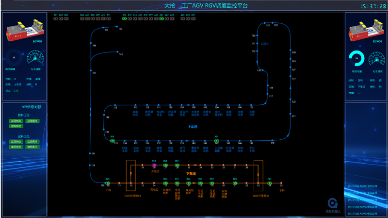 所有AGV、RGV的運行狀態,均由總控系統發任務后,后臺有序分工、自動協同,整個車間的裝配工位、上下線工位,返回位置實時展示在電子看板上,實現了全程任務可視化管理。