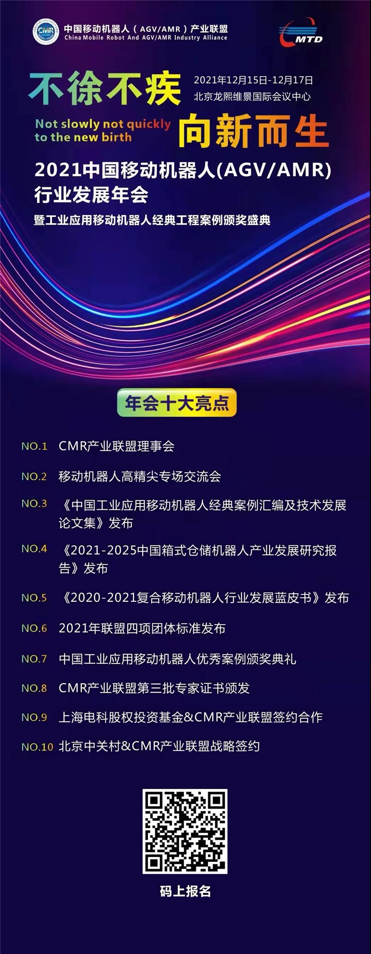 20211215-17日,在由中國移動機器人(AGV/AMR)產業聯盟主辦的“2021 中國移動機器人AGV/AMR)行業發展年會上,《中國工業應用移動機器人經典案例匯編及技術發展論文集》將正式發布,晚宴還將舉行盛大頒獎典禮,敬請期待!