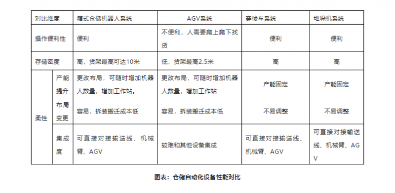 在3PL及電商倉(cāng)儲(chǔ)中,當(dāng)前主要有4類自動(dòng)化解決方案,箱式倉(cāng)儲(chǔ)機(jī)器人/AGV系統(tǒng)/穿梭車系統(tǒng)/堆垛機(jī)系統(tǒng),四類方案各有其優(yōu)劣勢(shì)。